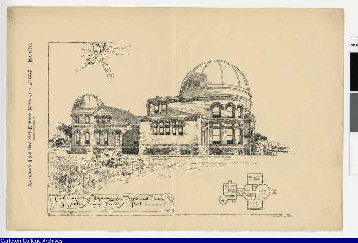 J. Watter Stevens, Archt., St. Paul, “Carleton College Observatory, Northfield Minn.,” Carleton Art Tour Omeka, accessed March 3, 2025, https://hhfinals.dgah.sites.carleton.edu/CAT/omeka/items/show/22.