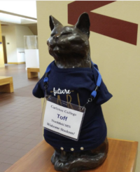 Toff the Cat was a friendly cat and frequenter of Carleton’s campus – a sort of celebrity and feline adoptee of the college. He was beloved by all and was especially popular with the library set. On March 9, 2011 Toff sadly died of cancer at age 14, but his presence was not forgotten. His April 1st birthday was celebrated with book displays in the Laurence McKinley Gould Library and festive decorations. Toff will always be a part of Carleton, cemented as one of the college’s mascots.