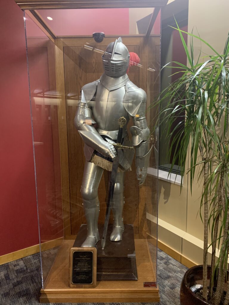 The Knight was chosen as Carleton’s official mascot back in 1950 as a salute to the tradition of Homecoming Knight, which died off in the 1970s. Homecoming Knight started in 1922 when a Carleton student who was dressed in linked armor on a horse led the homecoming parade to Laird Stadium while flaunting a spear and shield.