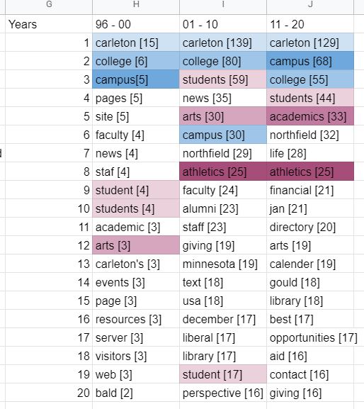 Overview: Here is a word cloud of the most frequent words used overall. Of course, “Carleton” is the most frequent. Just based on this word cloud alone, you can see the variety of topics that Carleton tries to emphasize on their front page – athletics, community, faculty, financial, teaching. With this variety of words, one can assume that Carleton is trying to appeal to a large audience, hoping to catch the eyes of prospective students.
